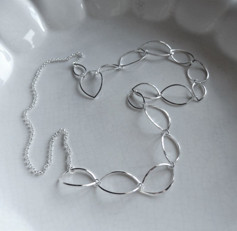 Voor dit collier heb ik eerst vierkant draad getrokken van een door mijzelf gegoten zilveren staaf. Daarvan heb ik markiezen gevormd en licht bol geslagen.
