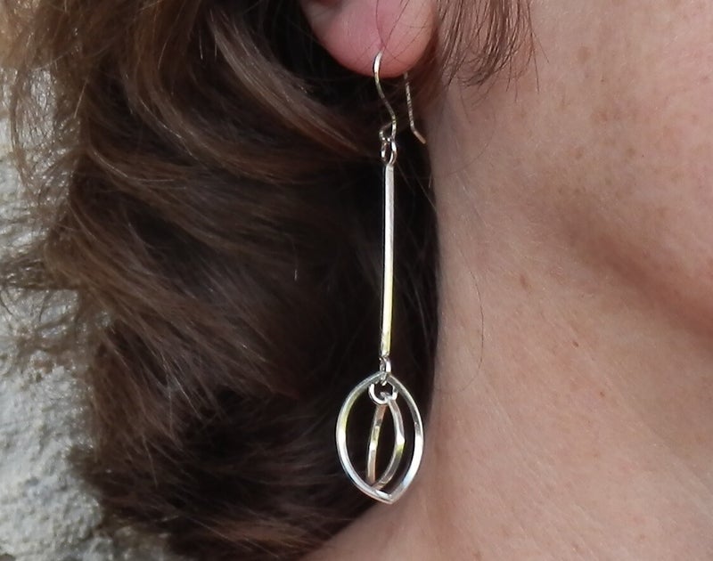 Lange, zilveren oorhangers., gemaakt van door mijzelf vierkant getrokken draad. De ongelijk hangende markiesvormen komen uit de serie 'Spechten'. (Zie colliers)