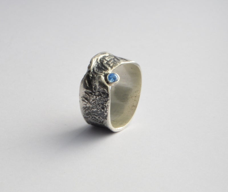 Brede zilveren ring. Met de vlam heb ik de band van de ring een grove structuur gegeven. Door het zilver te oxideren ('zwarten') en vervolgens te polijsten, krijgt de ring een bijzonder, organisch oppervlak. De binnenkant is glad.