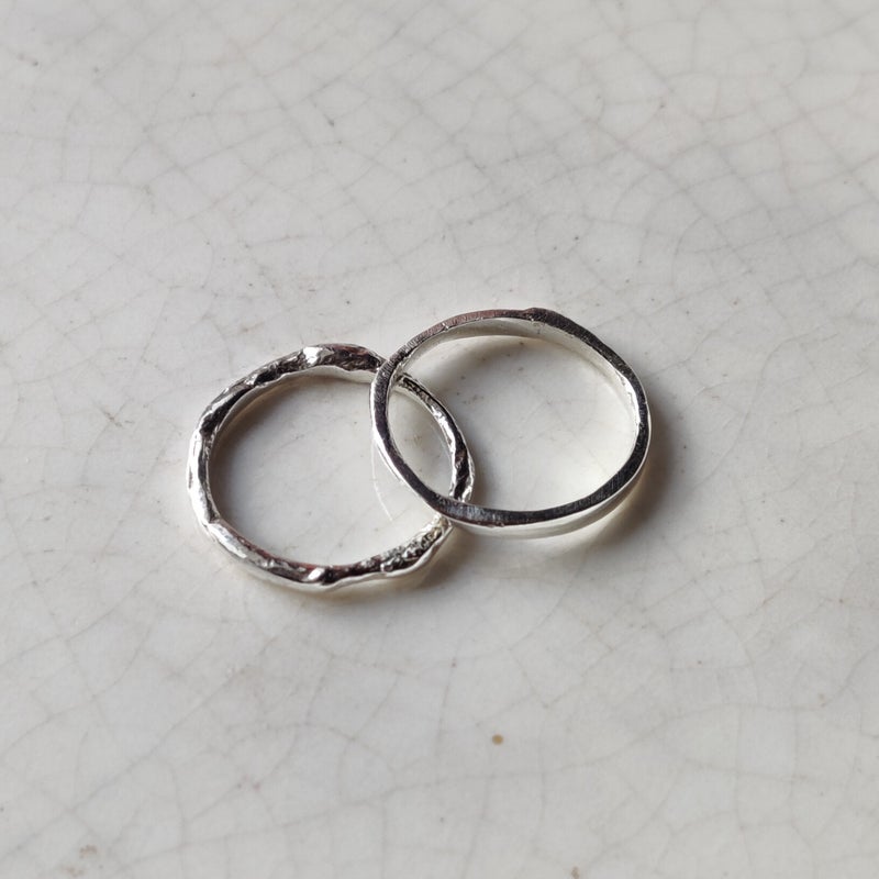 De ringen zijn met vuur bewerkt en hebben zo een organische structuur gekregen. De binnenkant van de band is glad geschuurd.