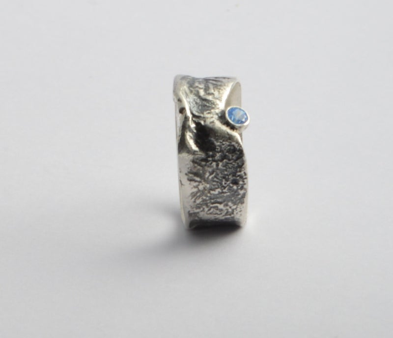 Zilveren ring, met de vlam bewerkt tot er een ruwe, organische structuur ontstond. Als contrast heb ik er een hoog-gepolijste ruitvorm in gezet. De binnenkant van de band is glad geschuurd.