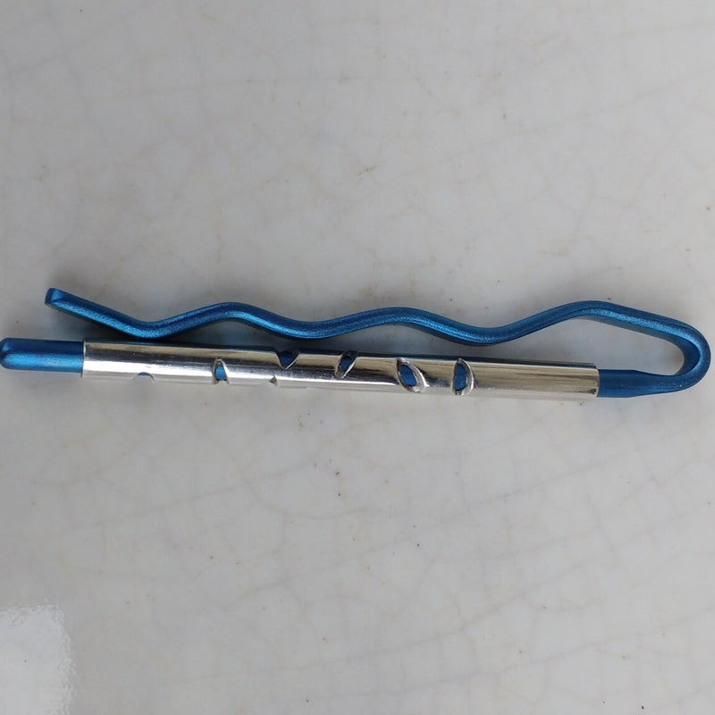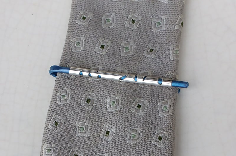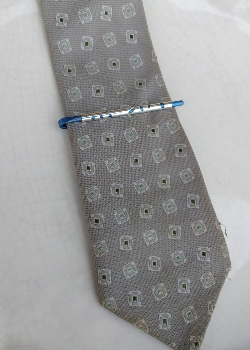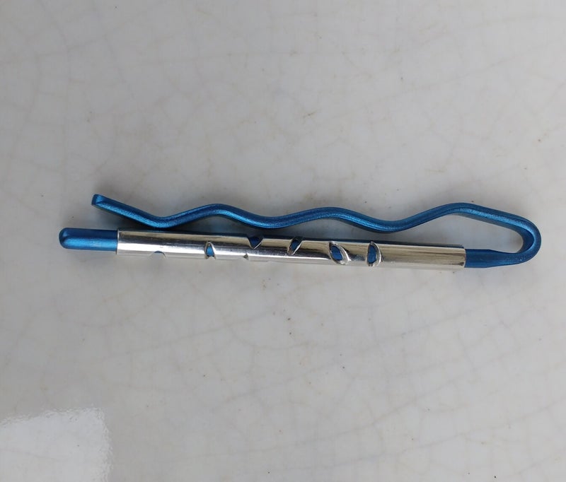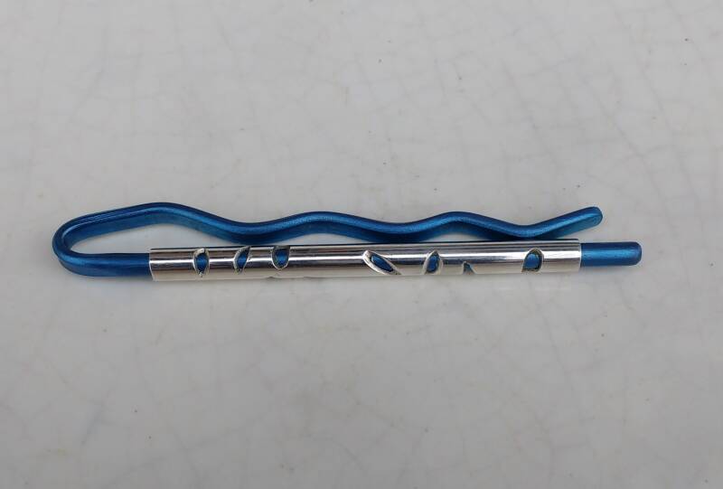 Bijzondere dasspeld, van blauw geanodiseerd titanium met een zilveren buisje er omheen.