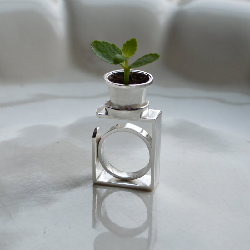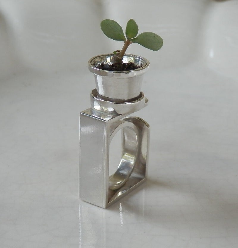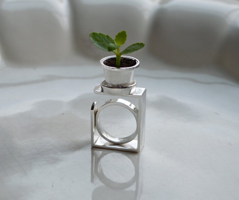 Zilveren ring - klein kunstobject - met een echt plantje.