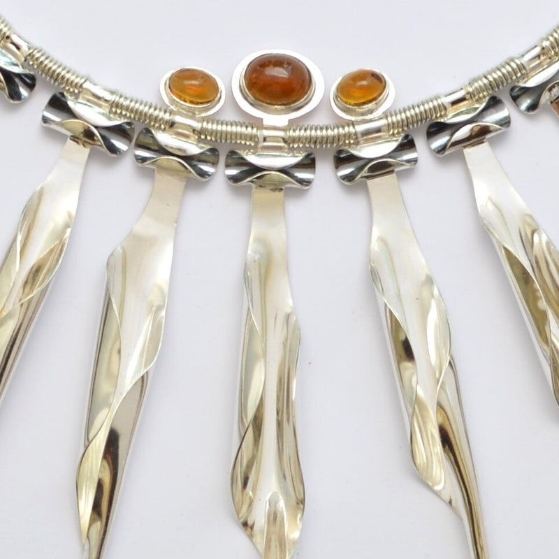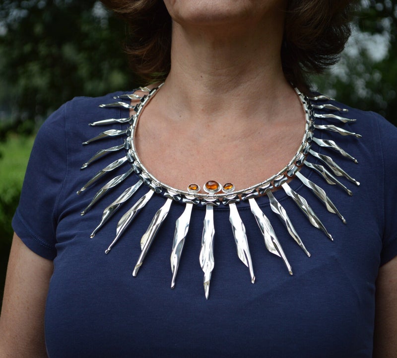 Uitzinnig collier, geïnspireerd op een schelpenketting uit Papoea Nieuw Guinea. Ieder onderdeeltje waaruit het is opgebouwd heb ik gemaakt van zelf gesmolten, gegoten, gewalst en gesmeed zilver.