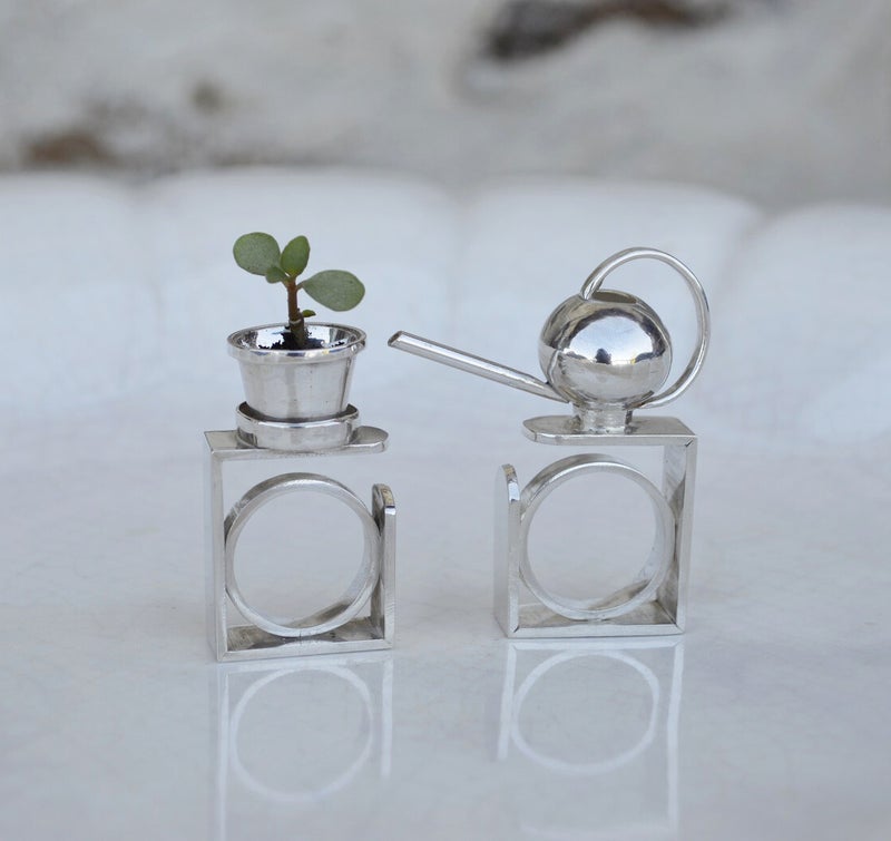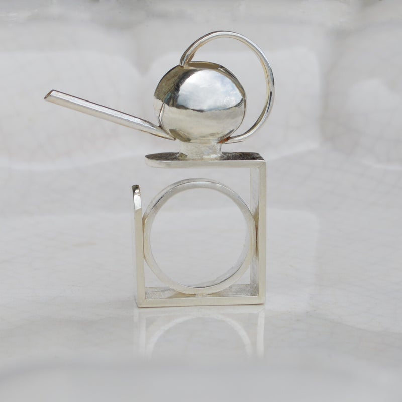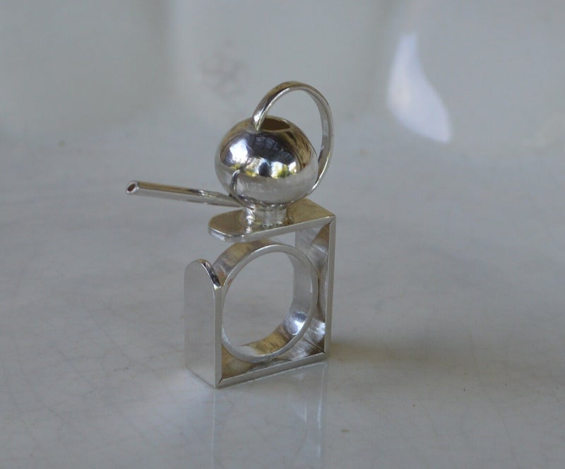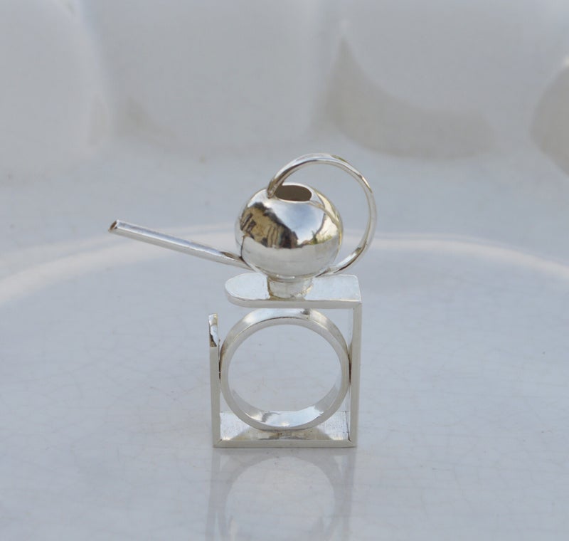 Zilveren ring - klein kunstobject - met een gietertje dat echt kan gieten.