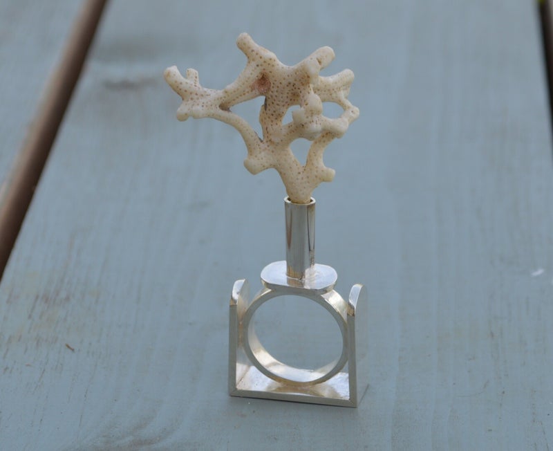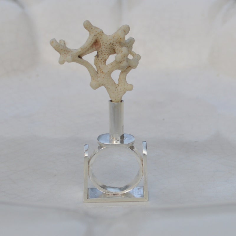 Op de vierkante ring van anderhalve cm dik zilver is een stuk koraal, gevonden op het strand van Bali, gemonteerd.